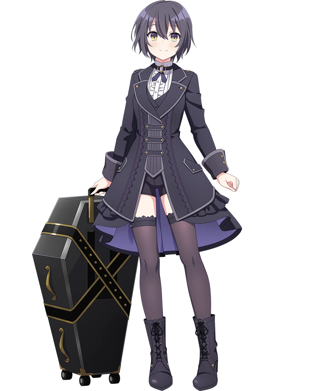 Chloe is a beautiful girl in her twenties. She usually wears a black cardigan in a classic style, under which wears a knitted white shirt. She also wears boots and black stockings.
